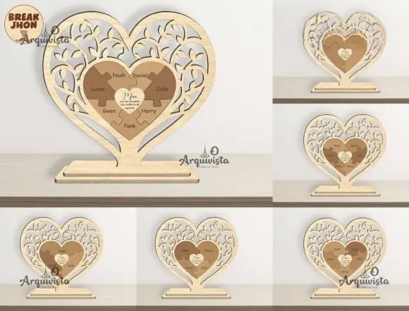 Este arquivo digital foi desenvolvido para corte a laser e apresenta um elegante padrão vazado em estilo árvore, com espaço interno em formato de peças de quebra-cabeça, ideal para personalização com nomes da família ou mensagens especiais.